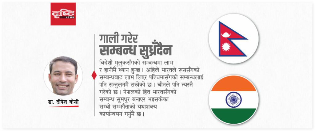 विदेशी मुलुकसँगको सम्बन्धमा लाभ र हानीमै ध्यान हुन्छ । अहिले भारतले रुससँगको सम्बन्धबाट लाभ लिएर पश्चिमासँगको सम्बन्धलाई पनि सन्तुलनमै राखेको छ । चीनले पनि त्यस्तै गरेको छ । नेपालको हित भारतसँगको सम्बन्ध सुमधुर बनाएर भइसकेका सम्धी सम्झौताको यथाशक्य कार्यान्वयन गर्नुमै छ ।