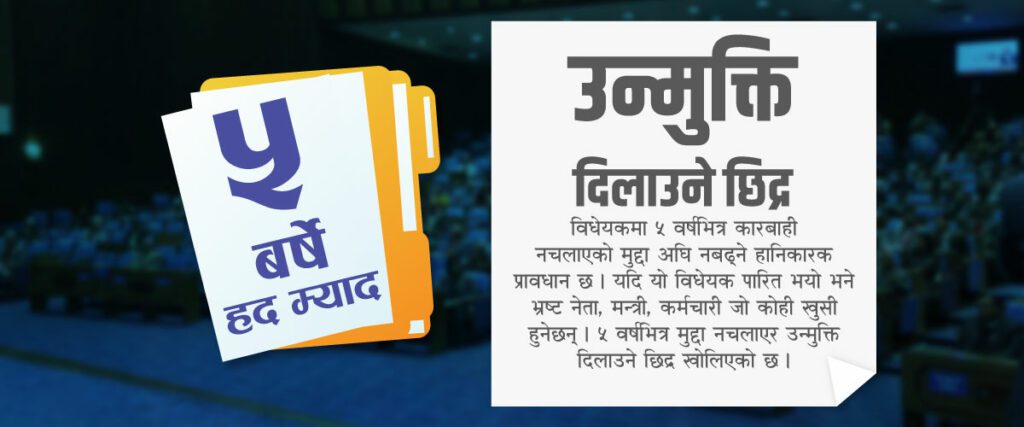 विधेयकमा ५ वर्ष भित्र कारबाही नचलाएको मुद्दा अघि नबढ्ने हानिकारक प्रावधान छ । यदि यो विधेयक पारित भयो भने भ्रष्ट नेता, मन्त्री, कर्मचारी जो कोही खुसी हुनेछन् । विधेयकमा ‘भ्रष्टाचार भएको ५ वर्षभित्र आयोगले कारबाही नचलाएमा सो अवधिपछि त्यस सम्बन्धमा कुनै कारबाही चलाइने छैन’ भन्दै उन्मुक्ति दिलाउने छिद्र खोलिएको छ ।