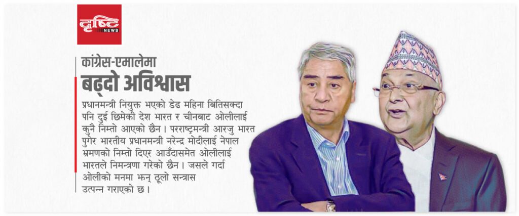 यो तथ्य हुँदाहुँदै पनि माओवादीको र एमालेको सत्ता समीकरण भत्काएर ओलीलाई सरकारको नेतृत्व लिन कांग्रेस हतारिएको थियो । नक्कली भुटानी शरणार्थी प्रकरणमा मुछिएका बेचन झालाई प्रहरीले असार ११ गते पक्राउ गरेपछि देउवा र उनकी पत्नी आरजु देउवा बालकोट पुगेर सत्ताको साँचो लिइदिन आग्रह गरेको जगजाहेर छ । त्यसकारण पनि यो सरकार बाध्यताको कडी हो भन्न कसैलाई कठिन छैन । यही बाध्यताको कडीमा नेतृत्व गरिरहेका ओलीले देउवालाई विश्वासमा लिन खोजिरहेका छन् ।