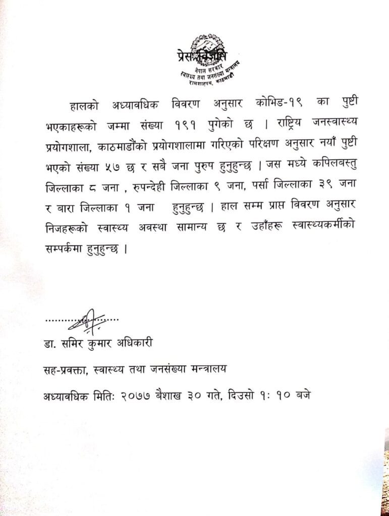 सोमबार २१ जनामा संक्रमण देखिएको थियो । नेपालमा संक्रमितको संख्या एक सय ९१ पुगेको छ ।