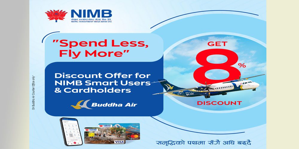 काठमाडौं । नेपाल इन्भेष्टमेण्ट मेगा बैंक लिमिटेडका ग्राहकवर्गहरुलाई बुद्ध एयरबाट यात्रा गर्दा आकर्षक छुट पाइने भएको छ । नेपाल इन्भेष्टमेण्ट मेगा बैंक (एनआइएमबी) लिमिटेड र बुद्ध एयरबीच भएको सम्झौतामा एनआइएमबीका ग्राहक साथै उहाँहरुका परिवार (बुबा, आमा, श्रीमती, छोरा/छोरी) लाई बुद्ध एयरको हवाई टिकट खरिद गर्दा ८ प्रतिशत छुट दिने भएको छ ।