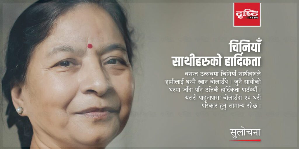 वसन्त उत्सवमा चिनियाँ साथीहरूले हामीलाई पनि घरमै खान बोलाउँथे । रेष्टुराँ जाने चलन त्यति चलिसकेको थिएन । कहिले कहाँ, कहिले कहाँ खासगरी सरोजका पुराना साथीहरू कहाँ गइरहन्थ्यौँ । जुनै साथीको घरमा जाँदा पनि उत्तिकै हार्दिकता पाउँथ्यौँ । यसरी पाहुनापासा बोलाउँदा २० थरी परिकार हुनु भनेको त एकदम सामान्य रहेछ ।