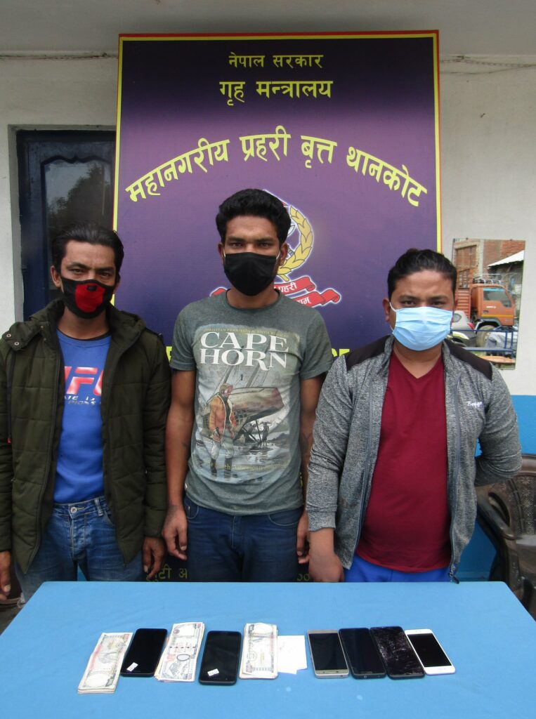 चन्द्रागिरी नगरपालिका– ४ घर भएका सरोज कामी, भगत शाही र शिव शाहीलाई महानगरीय प्रहरी वृत्त थानकोटले पक्राउ गरेको हो । उनीहरुले मंगलबार राती सवा १२ बजेको समयमा चन्द्रागिरि नगरपालिका ४ पानिघाट स्थित जंगलमा काठमाण्डौँबाट मकवानपुर तर्फ गइरहेको प्र. ३ –०१–२३ च – ११०९ नम्बरको एम्बुलेन्स जवर्जस्ती रोकी लुटपाट गरेको प्रहरीले जनाएको छ । आफुहरु सादा पोशाकको प्रहरी भने चेकजाँचको नाममा सवारी साधन रोकेर लुटेका हुन् ।