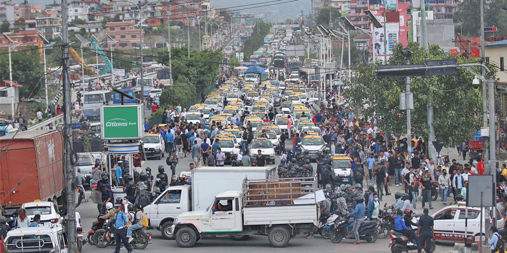 काठमाडौं । मेडिकल व्यवसायी दुर्गा प्रसाइँको अगुवाइमा ट्याक्सी चालकहरू प्रदर्शनमा उत्रिएका छन् । शुक्रबार उनीहरु भक्तपुरबाट ट्याक्सीसहित काठमाडौंतर्फ अघि बढेका थिए । जसमा कारण केही समय ट्राफिक व्यवस्थापन अस्तव्यस्त भएको थियो ।