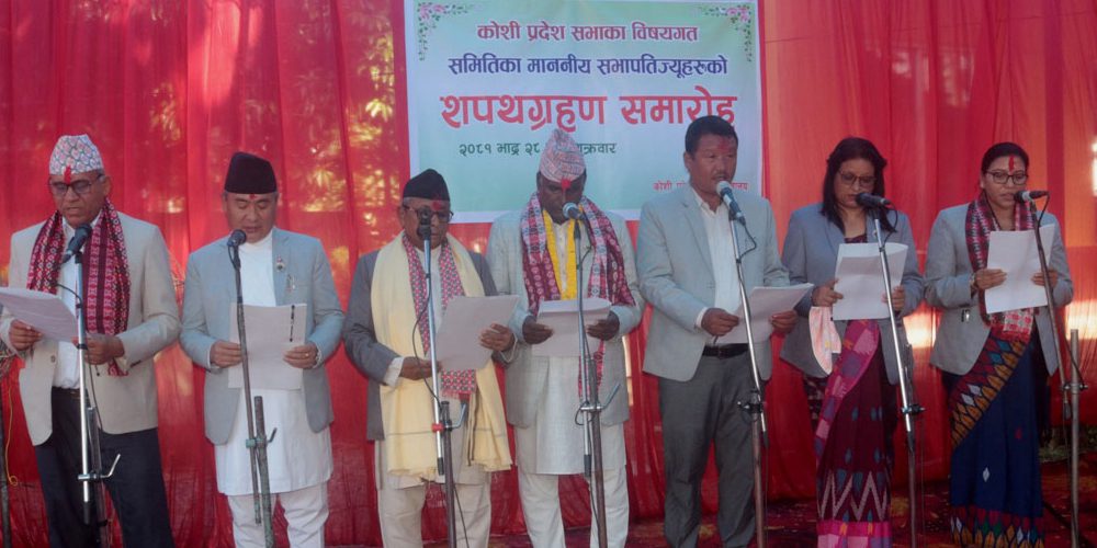 विराटनगर । कोशी प्रदेशसभा, विषयगत समितिका सभापतिहरूले आज सामूहिक पद तथा गोपनीयताको शपथ ग्रहण गरेका छन् । सभामुख अम्बरबहादुर विष्टले कोशी प्रदेशसभा नियमावली, २०७४ (पहिलो संशोधन) को नियम १३४ बमोजिम पद तथा गोपनीयताको शपथग्रहण गराएका हुन् ।