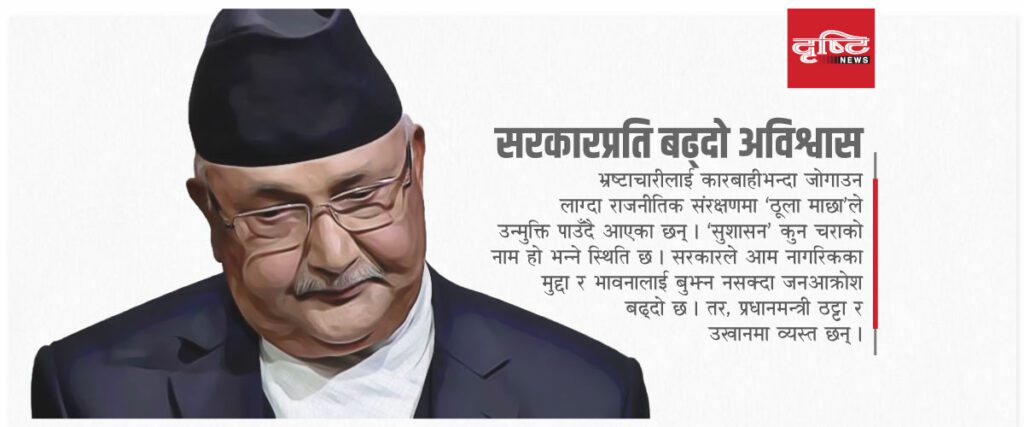 भ्रष्टाचारीलाई कारबाहीभन्दा जोगाउन लाग्दा राजनीतिक संरक्षणमा ‘ठूला माछा’ले उन्मुक्ति पाउँदै आएका छन् । ‘सुशासन’ कुन चराको नाम हो भन्ने स्थिति छ । सरकारले आम नागरिकका मुद्दा र भावनालाई बुझ्न नसक्दा जनआक्रोश बढ्दो छ । जनआक्रोशलाई सम्बोधन गर्दै अगाडि बढ्नु सरकारको जिम्मेवारी हो । तर, सत्ता र शक्तिको उन्मादमा रमाइरहेका प्रधानमन्त्री ओली मात्तिने मात्रै होइन, आत्तिनसमेत थालेका छन् ।