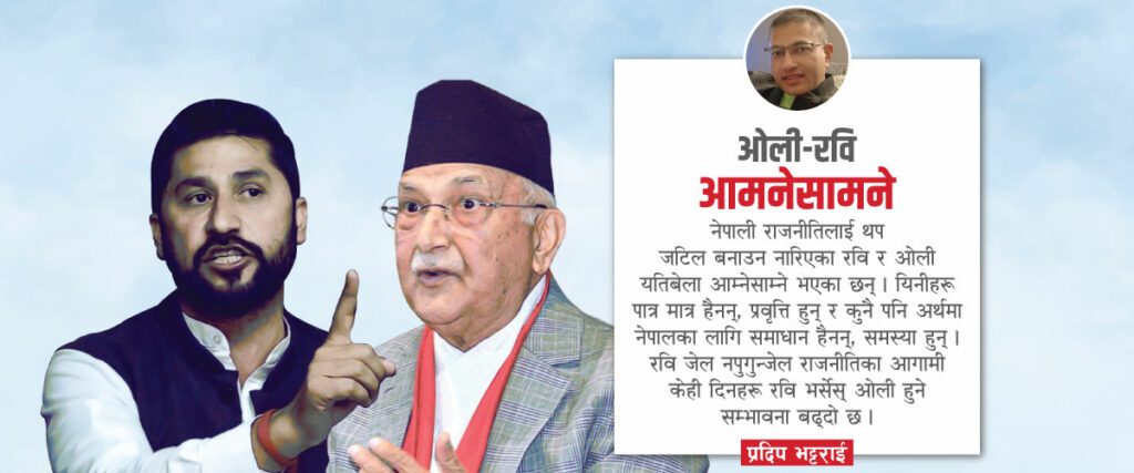 समग्रमा समस्याहरूको अँध्यारो सुरूङतिर धकेलिएको नेपाली राजनीति अरू जटिल हुदैछ । यसलाई थप जटिल बनाउन कुनै समय हल बाँधेर नारिएका रवि र ओली यतिबेला आमनेसामने भएका छन् । यिनीहरू पात्र मात्र हैनन्, प्रवृत्ति हुन् र कुनै पनि अर्थमा नेपालका लागि समाधान हैनन्, समस्या हुन् । रवि जेल नपुगुञ्जेल नेपाली राजनीतिका आगामी केही दिनहरू रवि भर्सेस ओली हुने सम्भावना बढ्दो छ । रवि जेल पुगेका दिन रास्वपा भन्ने घण्टीको रालो पनि झर्नेछ । त्यसपछि उनका भक्तहरू पनि जुम्राले लास छोडेरै घण्टी छोडेर चमर बजाउन थाल्नेछन् । नेपालको स्वार्थ केन्द्रित राजनीतिमा त्यो पहिलो दृश्य हैन, यस्ता दृश्यहरू धेरै पटक मञ्चन भैसकेका छन् ।