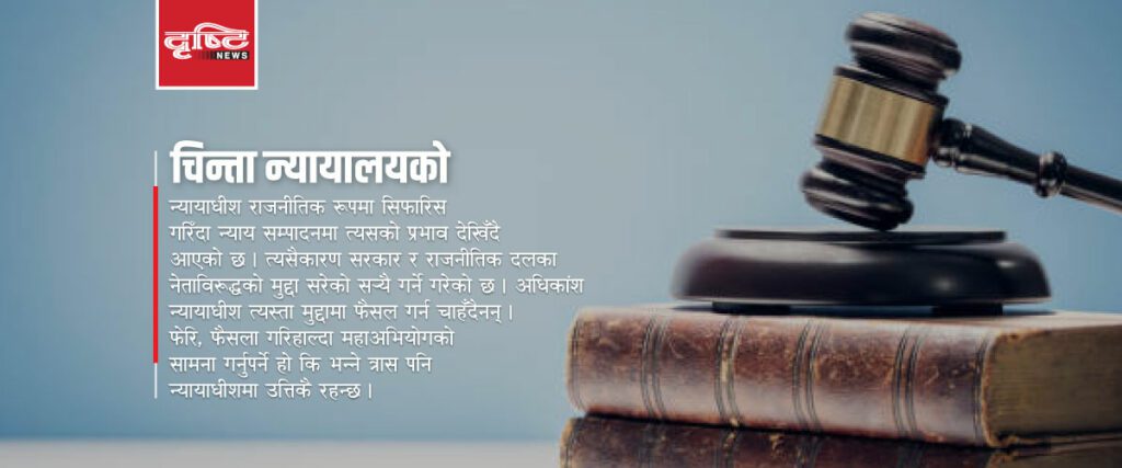 न्यायाधीश राजनीतिक रुपमा सिफारिस गरिँदा न्याय सम्पादनमा त्यसको प्रभाव देखिँदै आएको छ । त्यसैकारण सरकार र राजनीतिक दलका नेताविरुद्धको मुद्दा सरेको स¥यै गर्ने गरेको छ । अधिकांश न्यायाधीश त्यस्ता मुद्दामा फैसला गर्न चाहँदैनन् । फेरि, फैसला गरिहाल्दा महाअभियोगको सामना गर्नुपर्ने हो कि भन्ने त्रास पनि न्यायाधीशमा उत्तिकै रहन्छ ।