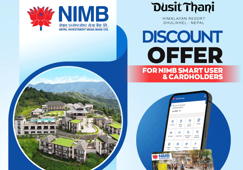 काठमाडौं । नेपाल इन्भेष्टमेण्ट मेगा बैंक लिमिटेडका ग्राहकवर्गहरुलाई दुसित थानी हिमालयन रिसोर्टमा आकर्षक छुट पाइने भएको छ । नेपाल इन्भेष्टमेण्ट मेगा बैंक (एनआईएमबी) लिमिटेड र दुसित थानी हिमालयन रिसोट, धुलिखेलबीच भएको सम्झौतामा एनआईएमबीका ग्राहकवर्गहरुलाई फुड एण्ड बेवरेज र स्पा सर्भिसमा १५ प्रतिशतसम्म छुट दिने भएको छ ।