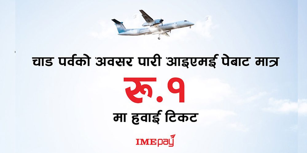 काठमाडौं । नेपालको पहिलो डिजिटल वालेट ‘आईएमई पे’ ले दशैं, तिहार र छठ पर्वलाई लक्षित गरी १ रुपैयाँमा आन्तरिक हवाई टिकट प्रदान गर्ने योजना सार्वजनिक गरेको छ ।