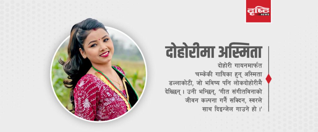 गीतभन्दा पनि म ‘दोहोरी च्याम्पियन’ प्रतियोगिताबाट चिनिएकी हुँ । २०७८ सालतिरको कुरा हो । उक्त दोहोरी च्याम्पियनमा भाग लिएपछि सांगीतिक बजारमा ‘गायिका अस्मिता डल्लाकोटी’ भनेर चिनिएँ । त्यसपछि मेरो हरेक गीतले मलाई प्लस गर्दै गयो ।