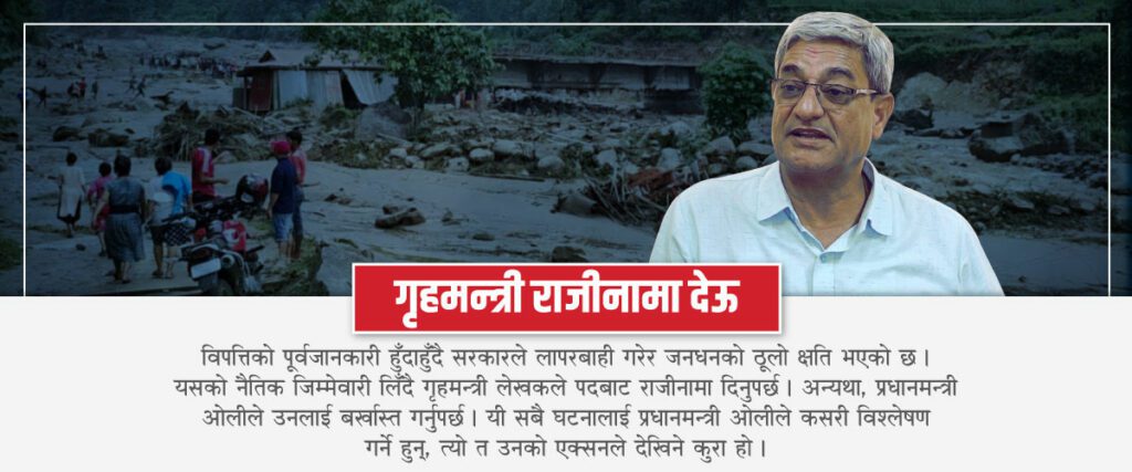 भविष्यमा लापरबाही नहोस् भनेर नैतिकताको आधारमा राजीनामा दिने गरिन्छ । यसपटक विपत्तिको पूर्वजानकारी हुँदाहुँदै सरकारले लापरबाही गरेर जनधनको ठूलो क्षति भएको छ । यसको नैतिक जिम्मेवारी लिँदै गृहमन्त्री लेखकले पदबाट राजीनामा दिनुपर्छ । अन्यथा, प्रधानमन्त्री ओलीले उनलाई बर्खास्त गर्नुपर्छ । यी सबै घटनालाई प्रधानमन्त्री ओलीले कसरी विश्लेषण गर्ने हुन्, त्यो त उनको एक्सनले देखिने कुरा हो ।