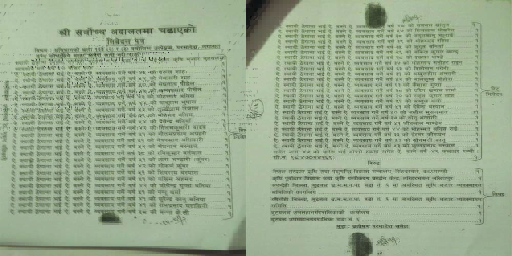 असोज ६ गते कारण देखाउ आदेश जारी गरि असोज १५ गते आजका लागि कृषि मन्त्रालय र बुटवल कृषि उपज थोक बजार व्यवस्थापन समिति, बुटवल उपमहानगरपालिका लगायतलाई छलफलका लागि बोलाएको एक व्यवसायीले बताए । मुद्दा लड्नका लागि ठूला सटरवालासँग एक लाख र साना सटरवालासँग ५० हजारका दरले रकम उठाइएको एक व्यवसायीले बताए ।