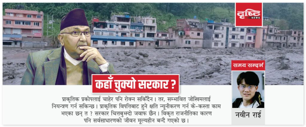 प्राकृतिक प्रकोपलाई चाहेर पनि रोक्न सकिँदैन । तर, सम्भावित जोखिमलाई नियन्त्रण गर्न सकिन्छ । प्राकृतिक विपत्तिबाट हुने क्षति न्यूनीकरण गर्न के–कस्ता काम भएका छन् त ? सरकार चित्तबुझ्दो जवाफ छैन । विकृत राजनीतिका कारण पनि सर्वसाधारणको जीवन मूल्यहीन बन्दै गएको छ ।