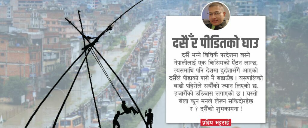 साहसकी प्रतीक मानिने कात्यायनी भवानी दुर्गाकै एक रूप मानिन्छिन् । उनको पूजा आराधना गरेर यो वर्ष को को साहसी हुन्छन् ?, त्यो त समयको ऐनामै हेरौला; अहिलेलाई भने बाढी पहिरोको दशाले छेकिएको यस पटकको दसैँमा लेख्न मनले नै मानेन– दसैँको शुभकामना !