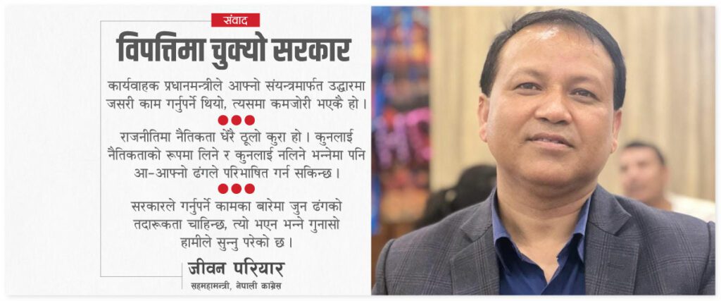 हामीले त्यो ढंगले काम पनि गर्दै आएका छौँ । चाहे अहिलेको बाढीपहिरोमा होस्, या हिजो भूकम्पको बेला नै किन नहोस् । हरेक विपत्तिमा नेपाली कांग्रेस अग्रपङ्क्तिमा छ । र, यसपालि पनि नेपाली कांग्रेसले आफ्नो सम्पूर्ण कार्यकर्ताहरू, भातृ संगठन र शुभेच्छुक संस्थाहरू सबैलाई परिचालन गरेर उद्धार र राहतमा हामी खटेका छौँ । अन्य पार्टीले पनि त्यसरी नै आफ्ना कार्यकर्तालाई आम नागरिकलाई सहयोग गर्नका लागि पार्टीभन्दा माथि उठेर लाग्दा राम्रो हुन्छ भन्ने पाठ सिक्नुपर्छ ।