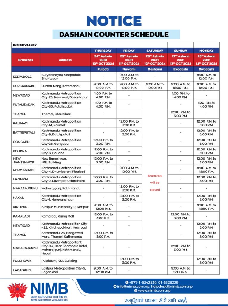 विजयादशमीको दिन सम्पूर्ण शाखा बन्द गर्ने र बाँकी दिनमा एक वा दुई दिन शाखा सञ्चालन गर्ने बैंकको योजना छ । तालिका अनुसार सम्बन्धित दिनमा तीन घण्टा सेवा सञ्चालन हुनेछ ।