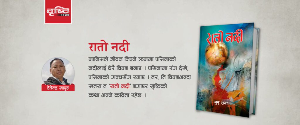 मानिसले जीवन जिउने क्रममा पसिनाको नदीलाई धेरै विम्ब बनाए । पसिनामा रङ्ग देखे, पसिनाको गन्धसँग रमाए । पसिनाले जमिन सिँचाएको कुरा लेखे । त्यसपछि मानिसले आँशुलाई पनि विम्ब बनाउनेको कमि छैन । आँशुको नदी बगाएरै सृष्टि चलेको कुरासम्म ओकलेका छन् । तर ति विम्बभन्दा खतरा त ‘रातो नदी’ बगाएर सृष्टिको कथा भन्ने कविता रहेछ । सृष्टि भनेको उम्रनुदेखि बाँच्दै जीवनको इहलिला समाप्त गर्नुसम्मको कथा हो, जो चलिरहन्छ ।