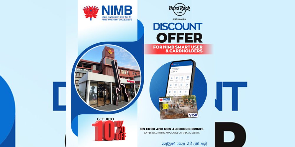 नेपाल इन्भेष्टमेण्ट मेगा बैंक (एनआईएमबी) लिमिटेड र ‘हार्ड रक क्याफे’, काठमाडौंबीच भएको सम्झौतामा एनआईएमबीका ग्राहकलाई फुड एण्ड बेवरेज (नन अल्कोहोलिक) मा १० प्रतिशत विषेश छुट दिने भएको छ ।