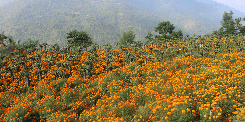 रामेछाप । फल लाग्ने अवस्थाको ड्रागन फ्रुटको बोट र त्यससँगै रोपिएको सयपत्रीको फूलले बारी पहेँलपुर छ । मन्थली नगरपालिका–५ सुनारपानीका रामबहादुर शाहीले बनमाराले भरिएको जग्गामा खनजोत गरी सुरु गरेको ड्रागन फ्रुट र सयपत्री फूलको खेती हेर्न त्यहाँ पुग्ने जो कोही पनि लोभिन्छन् ।