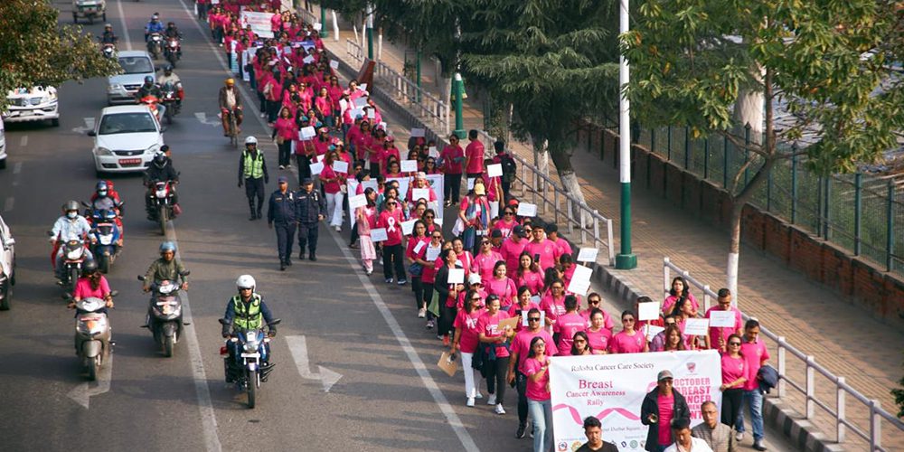 काठमाडौं । स्तन क्यान्सर विरुद्ध जनचेतना फैलाउन राजधानीमा वृहत् र्‍यालीको आयोजना गरिएको छ ।