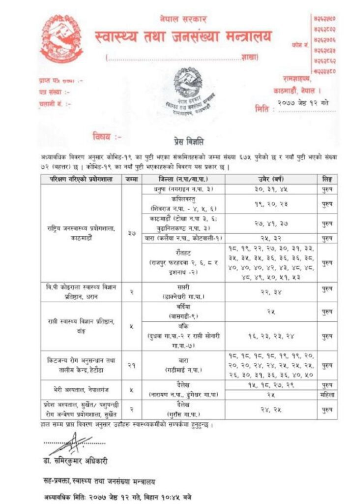 सोमबार एकैदिन ७२ जनामा कोरोना संक्रमण पुष्टि भएको छ । स्वास्थ्य मन्त्रालयका अनुसार त्यसमध्ये तीन जना काठमाडौंकाे टाेखा र बुढानिलकण्ठका युवाहरु छन् ।