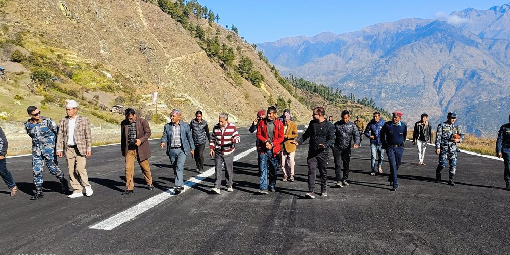 विमानास्थलको टर्मिनल भवन निर्माणको वर्तमान, प्रगति र ढिलाइबारे जानकारी लिन बुधबार जिल्ला समन्वय समितिका संयोजक मञ्जनबहादुर कार्कीको संयोजकत्व कर्णाली प्रदेशका सांसदद्वय जितबहादुर मल्ल र मङ्गलबहादुर शाही, प्रमुख जिल्ला अधिकारी कमलप्रसाद पाण्डेका साथै जनपथ, सशस्त्र प्रहरी, राष्ट्रिय अनुसन्धान विभागका प्रमुख, पत्रकार र नागरिक अगुवाको उपस्थितिमा निर्माणाधीन भवनको निरीक्षण गरिएको थियो ।