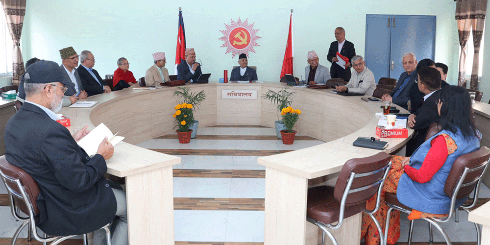 काठमाडौं । सत्तारुढदल नेपाल कम्युनिष्ट पार्टी (एमाले) सचिवालय बैठक पार्टी अध्यक्ष एवं प्रधानमन्त्री केपी शर्मा ओलीको अध्यक्षतामा च्यासलस्थित केन्द्रीय कार्यालय जारी छ । आज बिहान ११ बजेका लागि आह्वान गरिएको बैठक दुई घण्टा ढिलो सुरु भएको थियोे ।