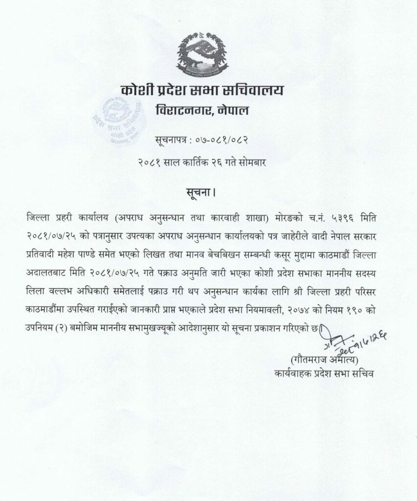 सोमबार प्रदेश सभाका कार्यवाहक सचिव गौतमराज अमात्यले जारी गरेको सूचनामा लिखत तथा मानव बेचबिखनसम्बन्धी कसुर मुद्दामा काठमाडौं जिल्ला अदालतबाट प्रदेशसभा सदस्य अधिकारीविरुद्ध पक्राउ अनुमति जारी भएको उल्लेख छ ।