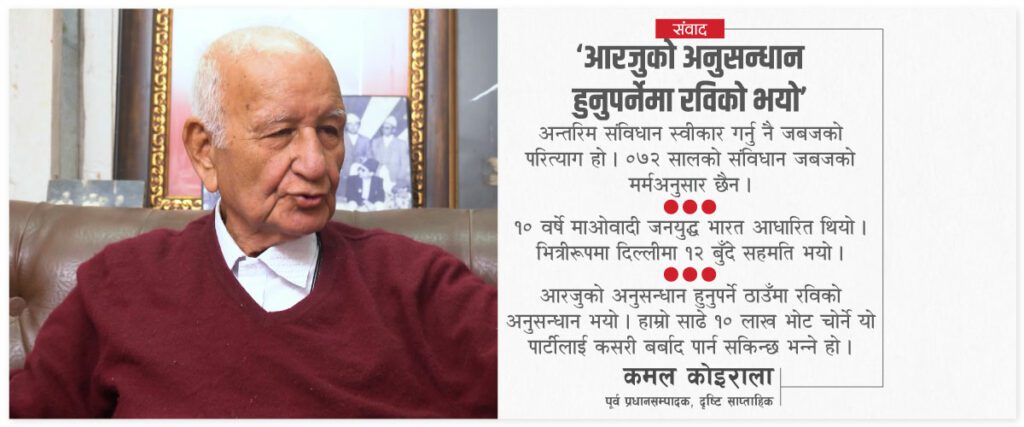 पुराना वामपन्थी नेता कमल कोइराला भन्छन् ‘कांग्रेस र एमाले सिद्धान्तबाट च्युत भएपछिको परिणाम देश र जनताले भोग्दैछन् ।’ दृष्टि साप्ताहिकको पूर्वप्रधान सम्पादक समेत रहेका कोइराला ‘अन्तरिम संविधान स्वीकार गर्नु नै जबजको परित्याग हो’ भन्छन् । ०७२ सालको संविधान जबजको मर्मअनुसार नभएको कोराइलाको भनाइ छ । पुराना वामनेता कमल कोइरालासँग दृष्टिले गरेको कुराकानी प्रस्तुत छ :