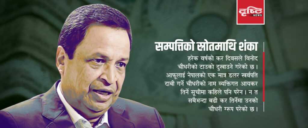 त्यसो त नेपालका एक मात्र कथित डलर खर्बपति ठान्ने विनोद चौधरीसमेत सबैभन्दा बढी कर तिर्ने करदातामा नपर्नुले उनको खर्बौको सम्पत्तिको स्रोतमाथि पनि शंका उठेको छ ।