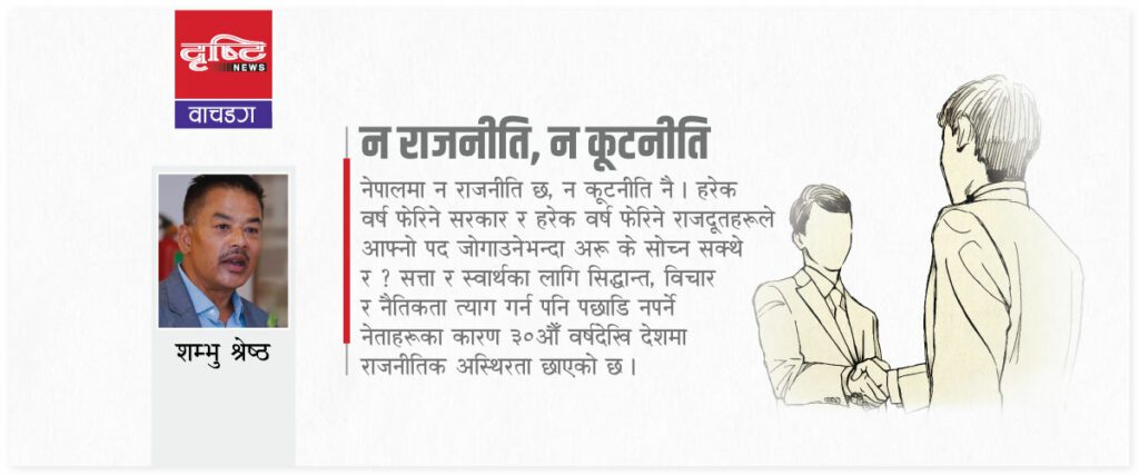 नेपालमा न राजनीति छ, न कूटनीति नै । हरेक वर्ष फेरिने सरकार र हरेक वर्ष फेरिने राजदूतहरूले आफ्नो पद जोगाउनेभन्दा अरु के सोच्न सक्थे र ? सत्ता र स्वार्थका लागि सिद्धान्त, विचार र नैतिकता त्याग गर्न पनि पछाडि नपर्ने नेताहरूका कारण ३०औँ वर्षदेखि देशमा राजनीतिक अस्थिरता छाएको छ ।