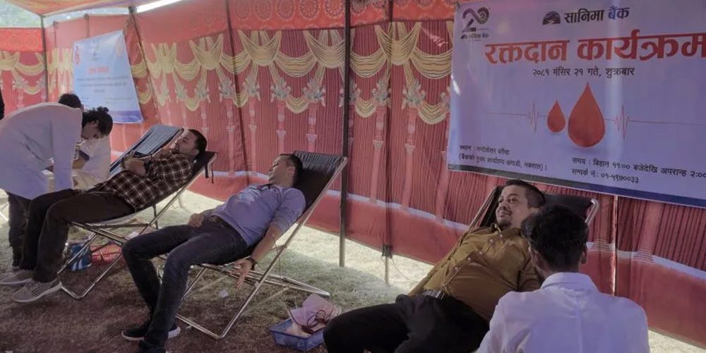 काठमाडौं । सानिमा बैंकले २०औँ वार्षिकोत्सवको अवसरमा सामुदायिक सेवा केन्द्र–नक्साल तथा सामुदायिक प्रहरी सेवा केन्द्र–नक्साल, ब्लड डोनर एसोसिएसन नेपाल ब्लोदान र कान्तिपुर अस्पताल, तीनकुनेको प्राविधिक सहयोगमा रक्तदान कार्यक्रम आयोजना गरेको छ ।