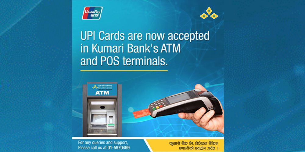 काठमाडौं । कुमारी बैंक लिमिटेडले आफ्नो एटीएम र पीओएस (पोइन्ट अफ सेल) टर्मिनलहरूमा यूपीआई (युनियनपे इन्टरनेसनल) का कार्ड स्वीकार गर्ने भएको छ ।