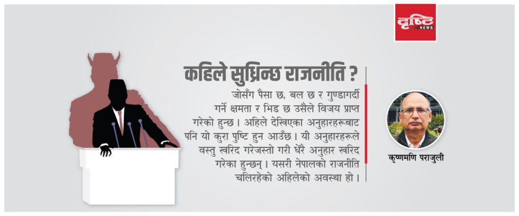 जोसँग पैसा छ, बल छ र गुण्डागर्दी गर्ने क्षमता र भिड छ उसैले विजय प्राप्त गरेको हुन्छ । अहिले देखिएका अनुहारहरूबाट पनि यो कुरा पुष्टि हुन आउँछ । यी अनुहारहरूले वस्तु खरिद गरेजस्तो गरी धेरै अनुहार खरिद गरेका हुन्छन् । यसरी नेपालको राजनीति चलिरहेको अहिलेको अवस्था हो ।