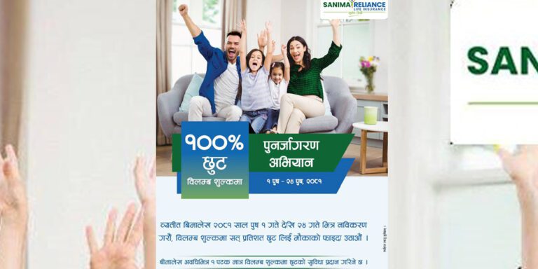 काठमाडौं । सानिमा रिलायन्स लाईफ इन्स्योरेन्सले नवीकरण नभएका बीमा लेखका लागि शत प्रतिशत विलम्ब शुल्क छुटसहितकोे पुनर्जागरण अभियान सुरु गरेको छ ।