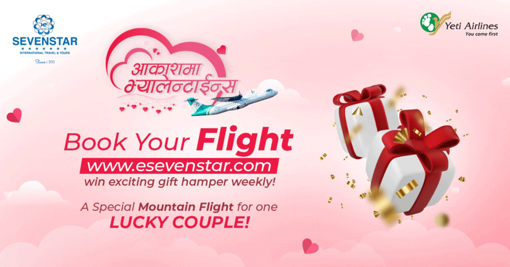 काठमाडौं । नेपाली बजारमा पछिल्लो समयमा उल्लेख्य लोकप्रियता हासिल गर्दै गएको अनलाईन ट्राभल एजेन्सि इसेभेनस्टार डटकमले ग्राहक लक्षित विषेश अफर ल्याएको छ । ‘आकाशमा भ्यालेन्टाईन’ अफरअन्तर्गत इसेभेनस्टार डटकम तथा सेभेनस्टार ट्राभल एण्ड टुर्समार्फत कुनै पनि अन्तर्राष्ट्रिय गन्तब्यका लागि टिकट काट्ने ग्राहकले विभिन्न किसिमका उपहार जित्ने अवसर पाउनेछन् ।