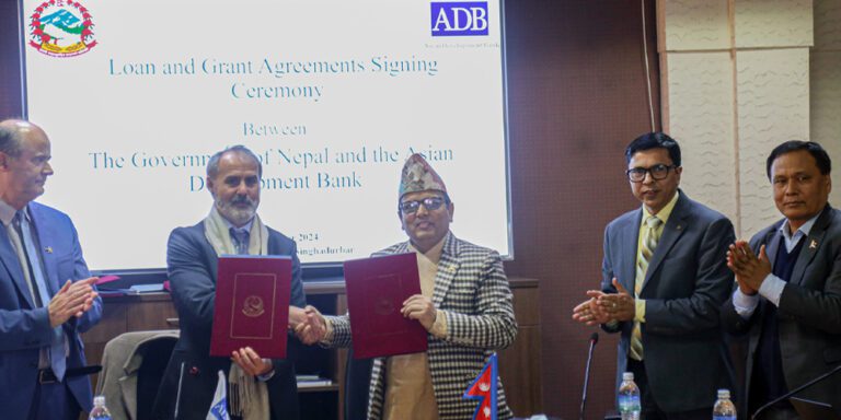 अर्थ मन्त्रालयमा आज आयोजित कार्यक्रममा ऋण एवं अनुदान सहायतासम्बन्धी सम्झौतापत्रमा अर्थसचिव डा. रामप्रसाद घिमिरे र एडिबीका देशीय निर्देशक आर्नो कोश्वाले हस्ताक्षर गरे ।