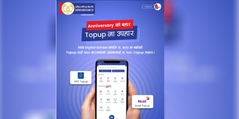 साथै, RBB Digital Sansar, राष्ट्रिय वाणिज्य बैंकको मोबाइल बैंकिङ्ग एप प्रयोग गरेर रु. ५०० वा सोभन्दा बढीको मोबाइल टपअप गर्ने ग्राहकहरू मध्ये १०० भाग्यशाली विजेताहरूलाई रु. १०० को टपअप बोनस प्राप्त गर्नेछन् ।