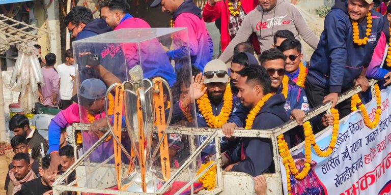 महोत्तरी । नेपाल प्रिमियर लिग (एनपिएल) पहिलो संस्करण विजेता जनकपुर बोल्ट्सका खेलाडीहरु महोत्तरीमा आज आयोजित ‘ट्रफी परेड’मा सहभागी भएका छन् । मधेस प्रदेशका सबै जिल्लामा विजयोत्सव मनाउने क्रममा आज यहाँ आइपुगेको उक्त टोलीलाई मटिहानीका नगरबासीले भव्य स्वागत गरे ।