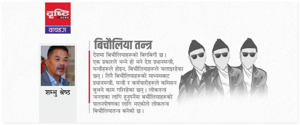 देशमा बिचौलियाहरूको बिगबिगी छ । एक प्रकारले भन्ने हो भने देश प्रधानमन्त्री, मन्त्रीहरूले होइन, बिचौलियाहरूले चलाइरहेका छन् । तिनै बिचौलियाहरूको माध्यमबाट प्रधानमन्त्री, मन्त्री र कर्मचारीहरूले कमिसन बुझ्ने काम गरिरहेका छन् । लोकतन्त्र जनताका लागि हुनुपर्नेमा बिचौलियाहरूको पालनपोषणका लागि भएकोले लोकतन्त्र बिचौलियातन्त्र बनेको छ ।
