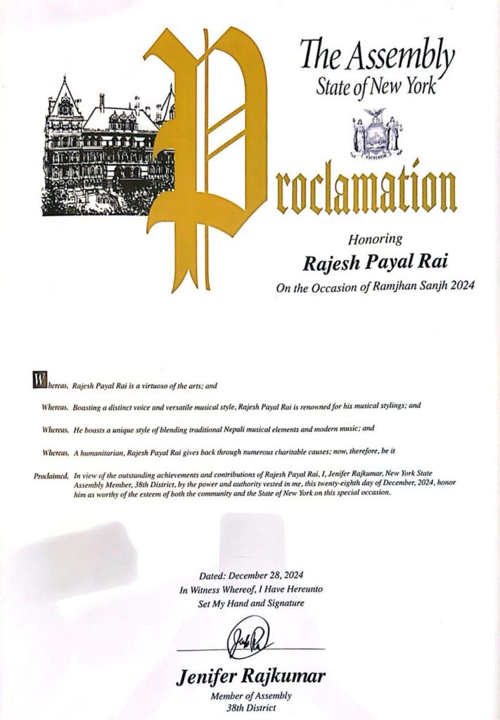 काठमाडौं । लोकप्रिय गायक राजेशपायल राईलाई अमेरिकाको न्यूयोर्कमा ‘विशेष सम्मान’ प्रदान गरिएको छ ।