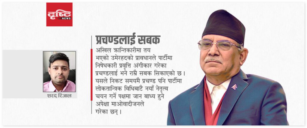 यसअघि तय गरिएका बैठक सार्दै प्रचण्डले यही पुस २१ गते केन्द्रीय समिति बैठक बोलाए पनि अझै अनिश्चित रहेको छ । विद्यार्थी संगठनमा उमेरहदको प्रावधानले अब नयाँ र शैक्षिक गतिविधिमै संलग्नहरू मात्रै नेतृत्वमा पुग्ने अवसर उमेरहदको प्रावधानले सिर्जना गरेको छ । यद्यपि, यसकै माउ पार्टी माओवादीमा भने करिब ३६ वर्षदेखि नै पुष्पकमल दाहाल प्रचण्ड पार्टी नेतृत्वमा विराजमान छन् ।