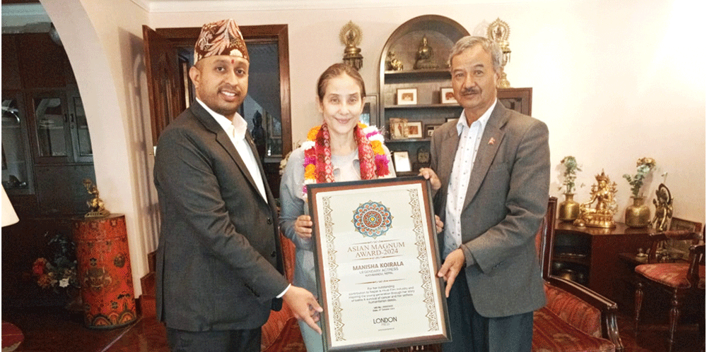 काठमाडौं । अभिनेत्री मनिषा कोइरालालाई ‘एसियन म्यागनम–२०२४’को प्रमाणपत्र हस्तान्तरण गरिएको छ । ‘वल्र्ड बुक अफ रेकर्डस्’ नेपाल च्याप्टरका अध्यक्ष सागर कटवालले लण्डन प्रेसद्वारा सम्मानित ‘एसिएन म्यागनम–२०२४’को प्रमाणपत्र अभिनेत्री कोइरालालाई हस्तान्तरण गरेका हुन् ।