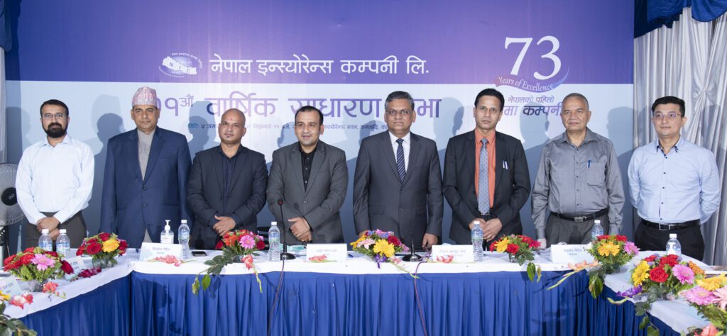 काठमाडौं, ५ असार । नेपालको पहिलो वीमा कम्पनीको रुपमा बि.सं.२००४ साल आश्विन ८ मा स्थापना भएको नेपाल ईन्स्योरेन्स कम्पनी लिमिटेडको आ.व.०७५/०७६ कोे ७१ औं वार्षिक साधारण सभा कम्पनीका सञ्चालक समितिका अध्यक्ष अर्जुन पौडेल शर्माको सभापतित्वमा २०७७ असार ५ कम्पनीकोे भवन कमलादी काठमाडौंमा सम्पन्न भयो ।