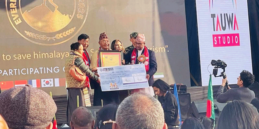 काठमाडौं । तेञ्जिङ नोर्गे शेर्पा र सर एडमन्ड हिलारीसँग पहिलोपटक सगरमाथा आरोहण गर्ने टोलीका एक्ला जीवित सदस्य कान्छा शेर्पालाई ‘एभरेष्ट टुरिजम अवार्ड–२०२५’को लाइफ टाइम एचिभमेन्ट अवार्डबाट सम्मान गरिएको छ ।