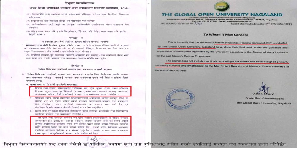 अनिवार्य उपस्थित भएर क्लास लिनुपर्ने र प्राक्टिकल गर्नुपर्ने प्राविधिक विषयमा अनलाइन र डिस्टान्स लर्निङ मोडबाट सर्टिफिकेट ल्याएर त्रिभुवन विश्वविद्यालय पाठ्यक्रम विकास केन्द्रमा समकक्षता निर्धारण गराउनेको भीड बढेपछि २०७४–०७५ सालबाटै त्रिभुवन विश्वविद्यालयले ग्लोबल ओपन युनिभर्सिटी, नागाल्याण्ड भारतबाट ल्याइएको माष्टर अफ साइन्स(एम.एस.सी.) रिमोट सेन्सिङ बिषयलाई मान्यता तथा समकक्षता दिन रोक लगाएको थियो ।