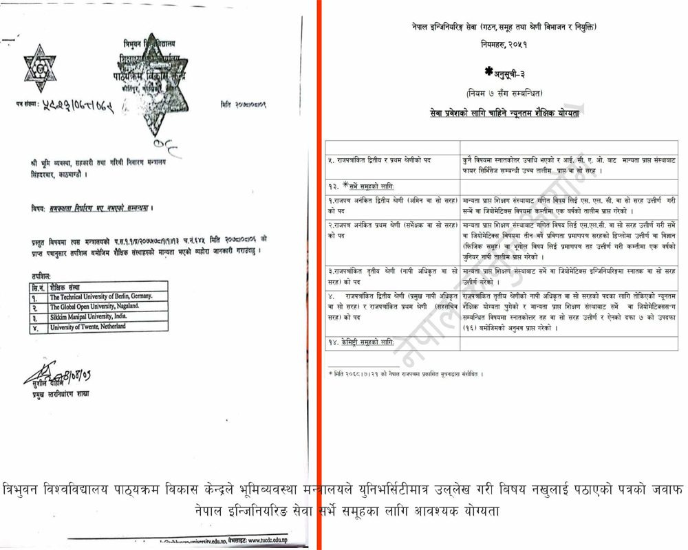 त्रिविले रोक लगाएको अवस्थामा भूमिब्यवस्था मन्त्रालयका सहसचिव भट्टले बिषय उल्लेख नगरी त्रिवि पाठ्यक्रम विकास केन्द्रलाई ग्लोबल ओपन युनिभर्सिटी, नागाल्याण्ड भारतको मान्यता छ कि छैन भनेर सोधेका छन् । प्राक्टिकल गर्नुपर्ने प्राविधिक विषयमा बाहेक अरु बिषयमा ग्लोबल ओपन युनिभर्सिटी, नागाल्याण्ड भारतका प्रमाणपत्रलाई त्रिविले मान्यता दिएको छ । तर नापी अधिकृत सुग्रिव यादवलाई ग्लोबल ओपन युनिभर्सिटी, नागाल्याण्डकै प्रमाणपत्रका आधारमा बढुवा गर्न बिषय उल्लेख नगरी युनिभर्सिटीको मान्यता भए नभएकोमात्र सोधिएको छ । जसका कारण त्रिविलाई समेत गुमराहमा पार्न खोजिएको देखिन्छ ।