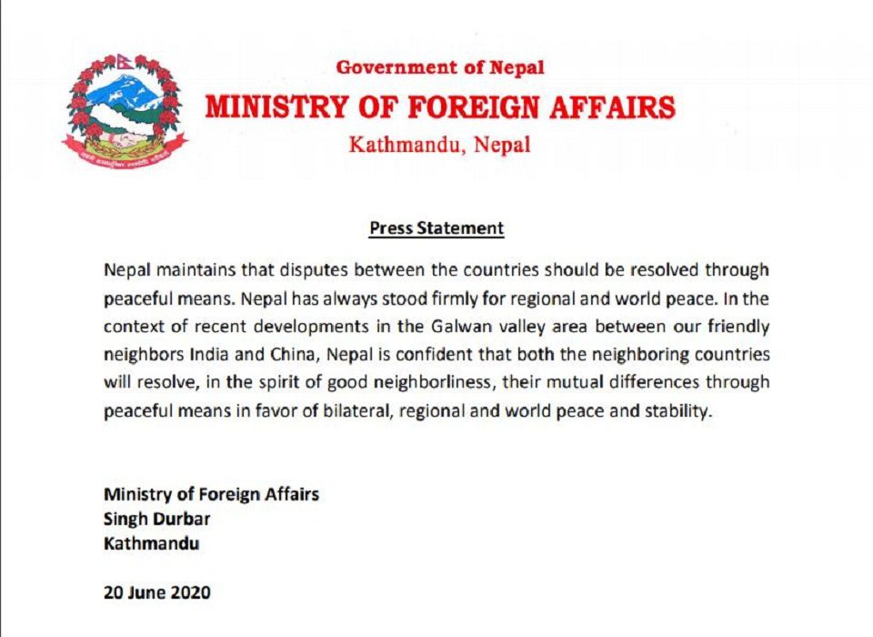 नेपाल क्षेत्रीय तथा विश्वमा शान्तिको पक्षमा रहेको भन्दै गलवान भ्यालीमा भएको विवाद शान्तिपूर्ण रुपमा समाधान हुने विश्वास लिइएको उल्लेख छ । गलवान भ्यालीमा भएको हिंसामा २० जना भारतीय सैनिकको मृत्यु भएको थियो । जून घटनापछि दुई देशबीच आरोप प्रत्यारोप चलिरहेको छ ।