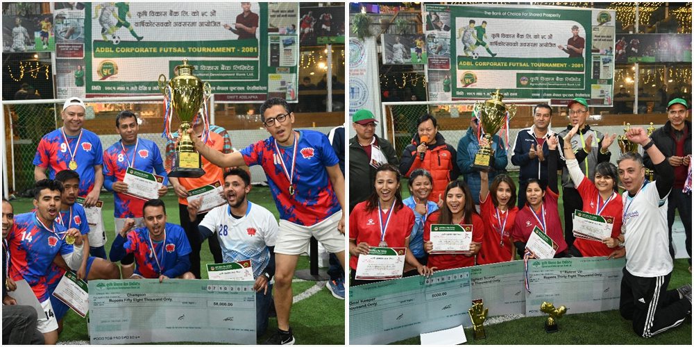 काठमाडौं । कृषि विकास बैंकको ५८औँ वार्षिकोत्सवको अवसरमा आयोजित एडिबिएल कर्पोरेट फुटसल २०८१ को उपाधि कृषि विकास बैंक र नेपाल ईन्भेष्टमेण्ट मेगा बैंकले जितेका छन् ।